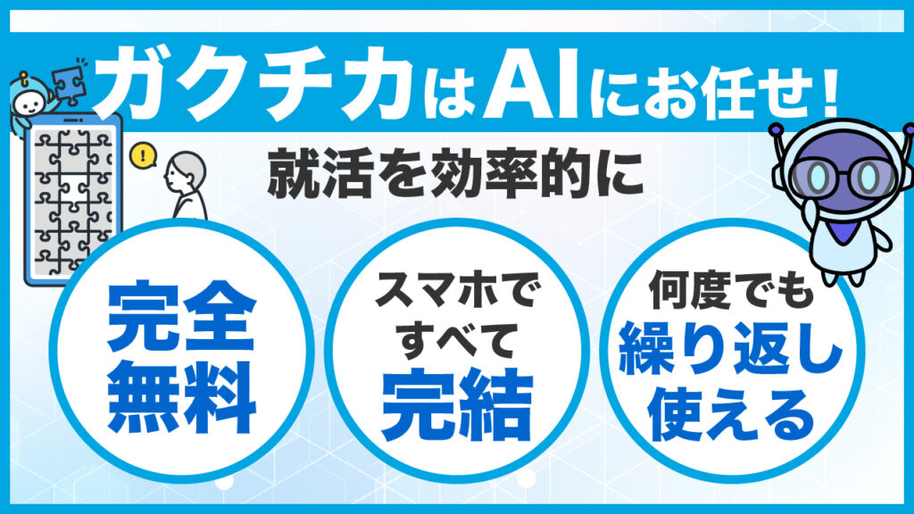 完全無料で何度でも利用できるため、複数企業のガクチカづくりにも対応できます。「時間をかけずに、評価されるガクチカを用意したい」という方は、ぜひ一度試してみてください。