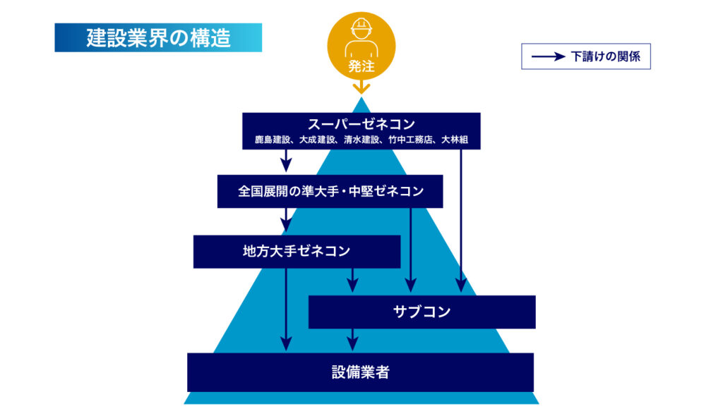 このため建設業界全体は「殿様と家来」に例えられるような縦系列の関係とも言われ、ゼネコン(元請)とサブコン(下請)が協力して建設プロジェクトを完成させる体制が築かれています。