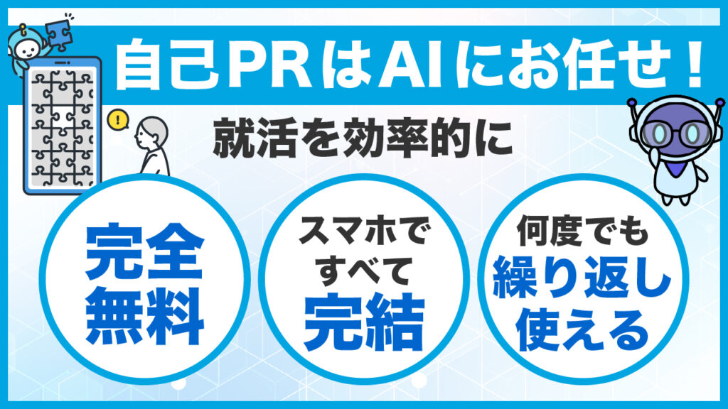 完全無料で何度でも利用できるため、複数企業の自己PRづくりにも対応できます。「時間をかけずに、評価される自己PRを用意したい」という方は、ぜひ一度試してみてください
