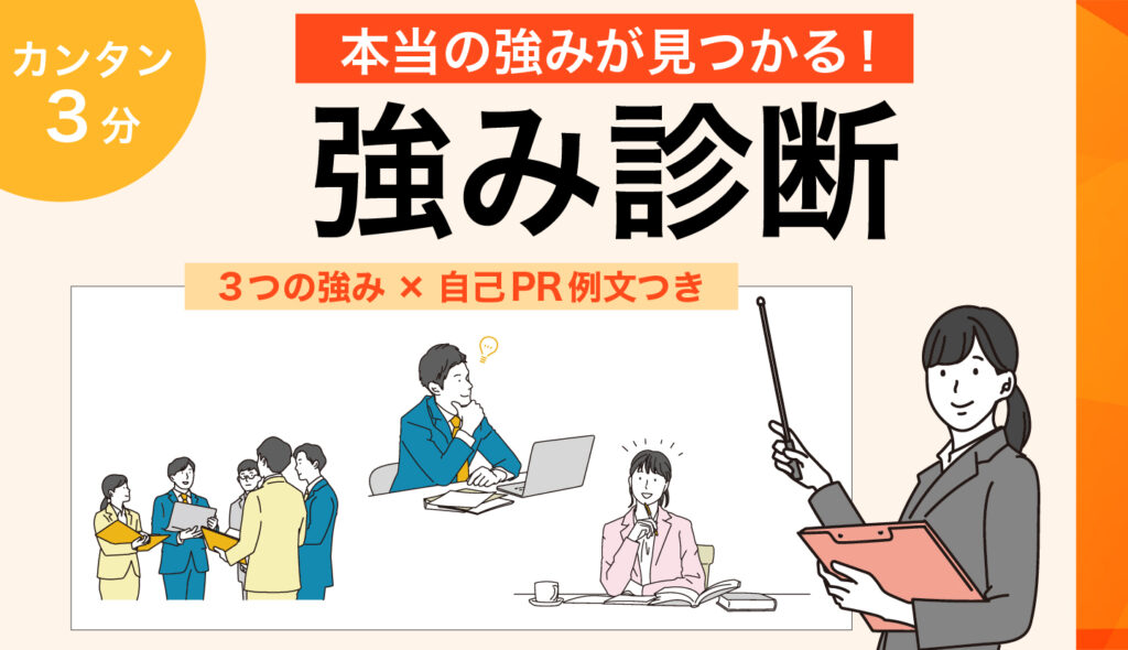 自分本来の強みでなければ、自己PRは薄っぺらいものになってしまいます。まずは強み診断を使って、自分本来の個性を強調でき、かつ評価される強みを知っておきましょう。