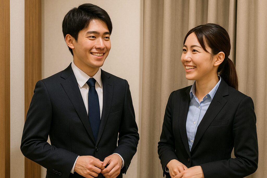 試着時には立った姿勢だけでなく、座ったときのシワや窮屈さも確認してください。動きやすく、どの角度から見ても清潔に見えるスーツが理想的です。