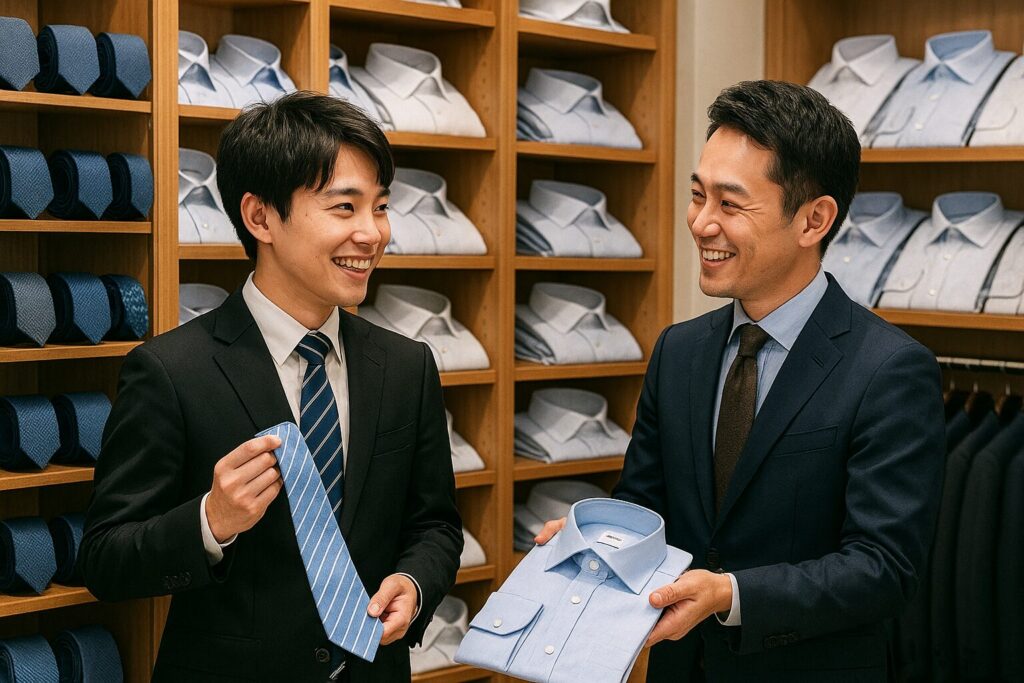 さらに、シャツ・ネクタイ・靴などの周辺アイテムをトータルでコーディネートすることで、統一感と信頼感が生まれます。
